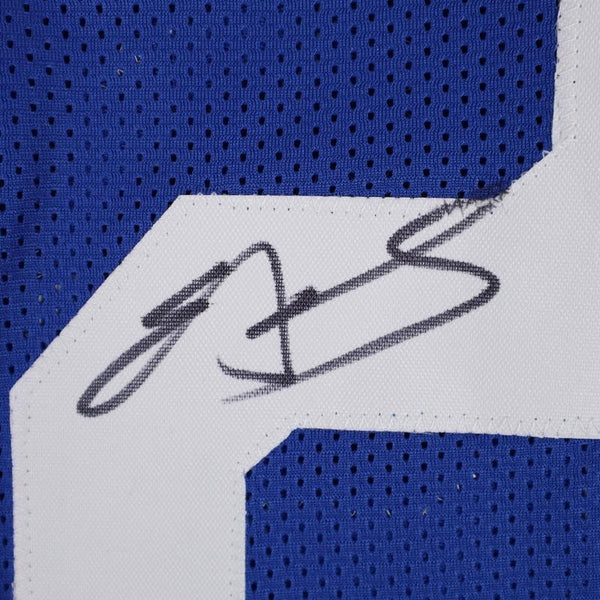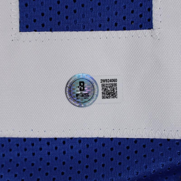 Custom on-field style pro cut jersey. Everything is sewn on, size XL. Hand-signed by Edgerrin James. The autograph includes an official Beckett Authentication Services serially numbered scannable hologram and QR Code card for authenticity purposes. The signing of this item was witnessed by Beckett.Authentication: Beckett Scannable Hologram with QR Code card