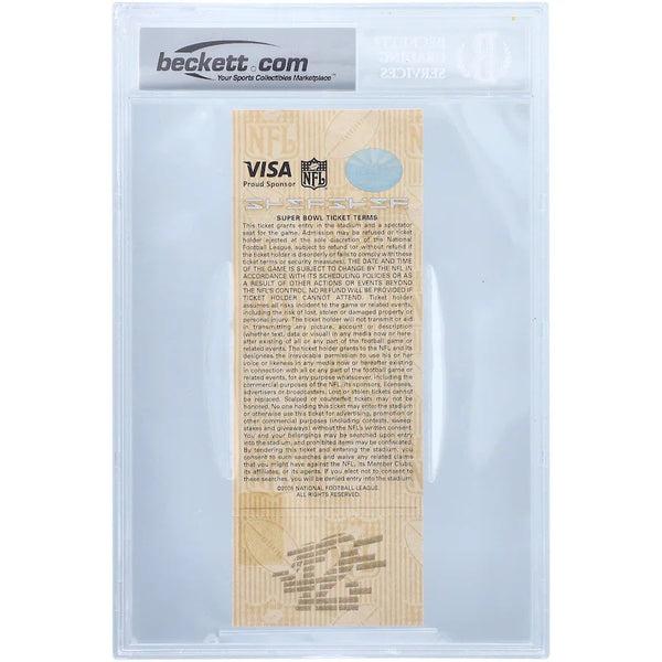 Featured is an Eli Manning signed New York Giants Super Bowl XLII ticket, inscribed "SB XLII MVP". This ticket has been hand signed by Manning and has been authenticated and encapsulated by Beckett, receiving an autograph grade of 10. This ticket would make a great addition to any sports memorabilia collection! SPECIFICATIONS Autographed By: Eli Manning Team: New York Giants Sport: Football Authentication: Beckett