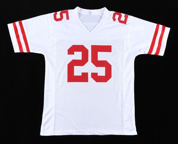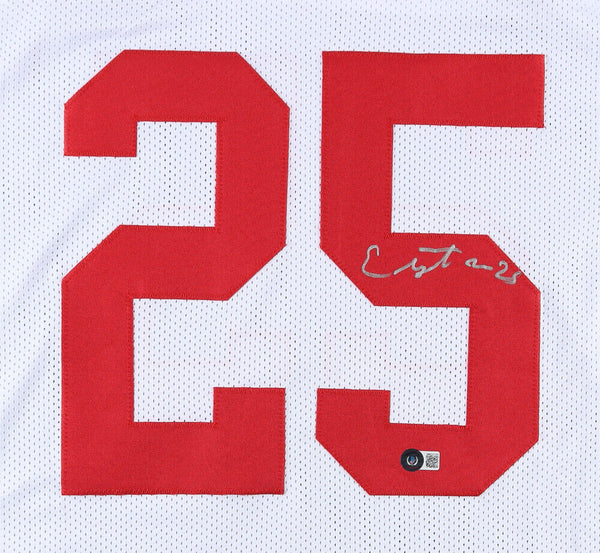 Custom on-field style jersey. Everything is sewn on, size XL. Hand-signed by Elijah Mitchell.The lot / autograph(s) includes an official Beckett Authentication Services serially-numbered hologram for authenticity purposes. The signing of this item was witnessed by Beckett.Authentication: Beckett Hologram