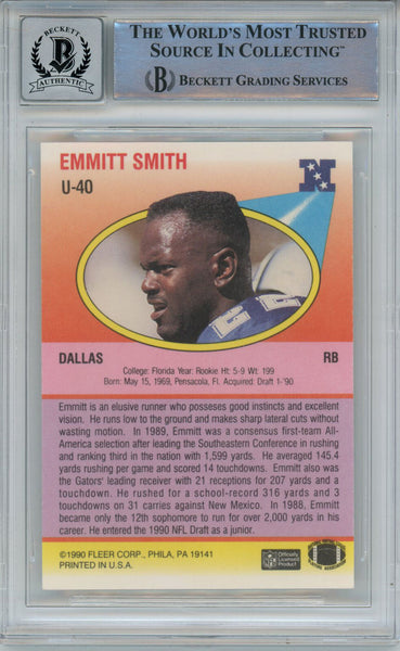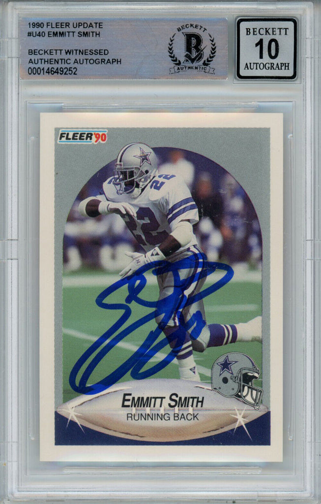 Emmitt Smith Autographed 1990 Fleer U-40 Rookie Card Beckett 10 Slab 39281 The number in the listing title is just an inventory sku for our records and is not the authentication number. This is the exact item that you will receive so please see pictures for condition. This is a trading card that was personally autographed by Emmitt Smith. This has been professionally slabbed by Beckett Authentication Services (BAS) and includes a certificate of authenticity from Denver Autographs.