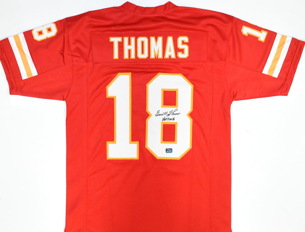 THIS IS NOT AN NFL JERSEY. THIS HAS NO TAGS, NO LOGOS, NO EMBLEMS. This is a hand autograph of Emmitt Thomas of the Kansas City Chiefs on a Custom made (non-name brand) Authentic Style Jersey with stitched letters and numbers. This item has a Prova Authentication, which comes with a Prova numbered sticker hologram. You can view this item on the Prova Authentication website. It was signed either at a public autograph appearance or a private signing. This is a stock photo of the item. Although you may not receive this exact item, the item you receive is virtually identical and brand new in great shape. Jersey size is XL. THIS IS NOT AN NFL JERSEY. THIS HAS NO TAGS, NO LOGOS, NO EMBLEMS. This is a hand autograph of Emmitt Thomas of the Kansas City Chiefs on a Custom made (non-name brand) Authentic Style Jersey with stitched letters and numbers. This item has a Prova Authentication, which comes with a Prova numbered sticker hologram. You can view this item on the Prova Authentication website. It was signed either at a public autograph appearance or a private signing. This is a stock photo of the item. Although you may not receive this exact item, the item you receive is virtually identical and brand new in great shape. Jersey size is XL.