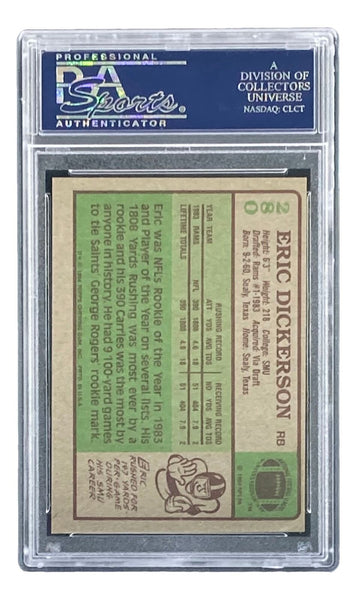 Featured is an Eric Dickerson signed 1984 Topps #280 Los Angeles Rams rookie card, inscribed "HOF 99". This card has been hand signed by Dickerson and has been authenticated and encapsulated by PSA. This card would make a great addition to any sports memorabilia collection! SPECIFICATIONS Autographed By: Eric Dickerson Team: Los Angeles Rams Sport: Football Authentication: Professional Sports Authenticator (PSA)