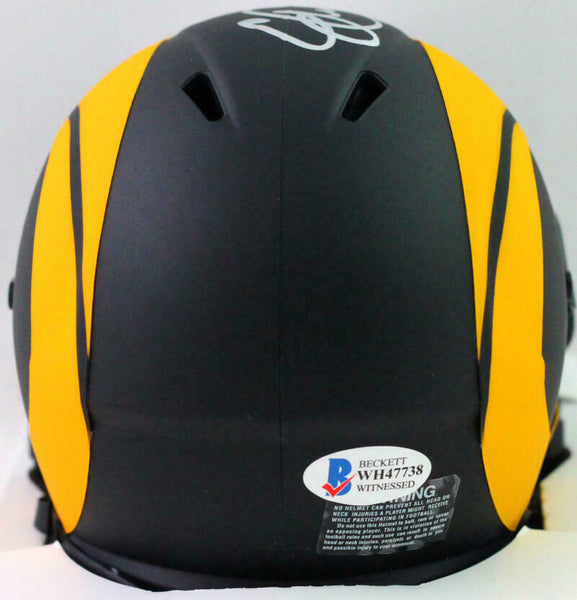 Eric Dickerson Signed Rams FS Eclipse Speed Mini Helmet w/ HOF- Beckett W*Silver This is an Eric Dickerson of the Los Angeles Rams hand autographed Riddell football eclipse speed replica mini helmet. This item has a Beckett Witnessed Authentication, which comes with a Beckett numbered sticker and a matching Beckett Certificate of Authenticity. You can view this item on the Beckett Authentication website, it shows when and where the item was signed. It was signed either at a public autograph appearance or a private signing. This is a stock photo of the item. Although you may not receive this exact item, the item you receive is virtually identical, brand new, and in great shape.