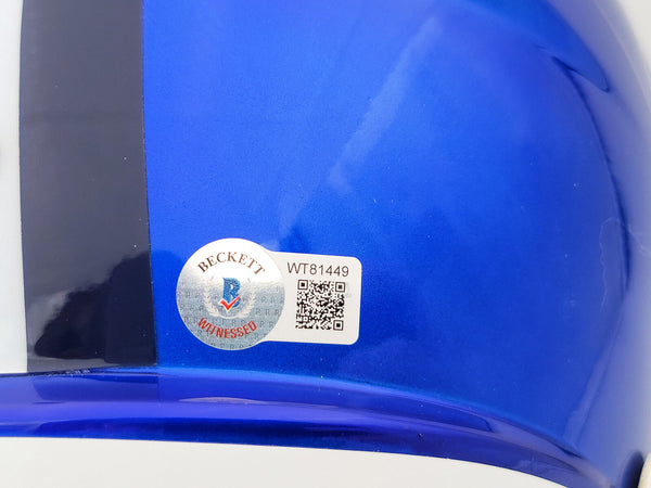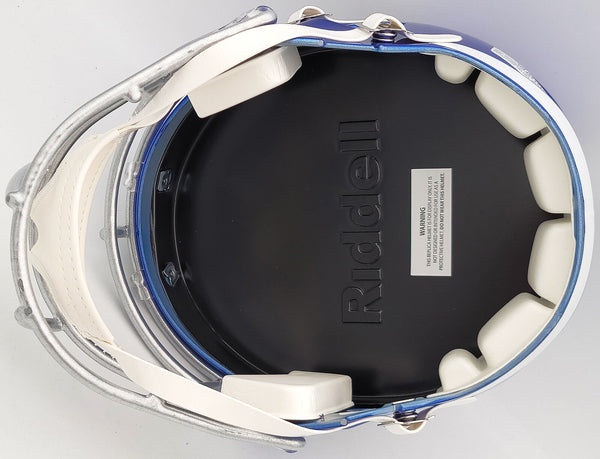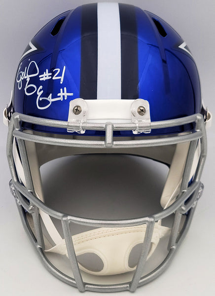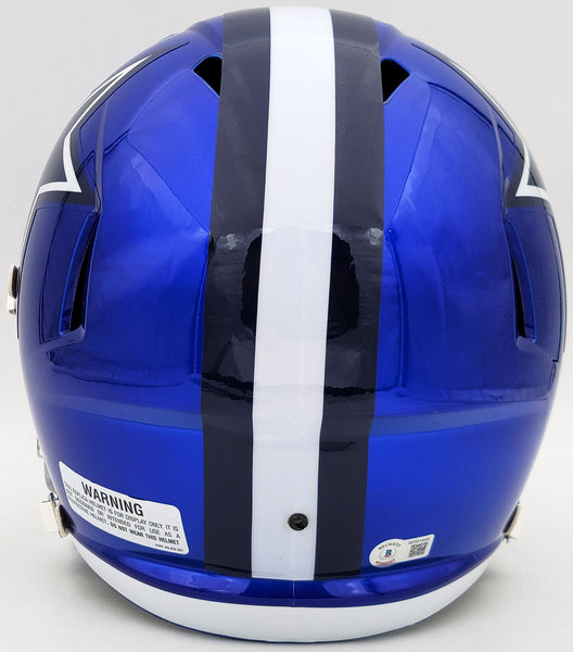 This is a Dallas Cowboys Flash Blue Full Size Replica Speed Helmet that has been hand signed by Ezekiel Elliott. The Flash helmets are delicate and may have some marks or scratches on them. This item has been certified authentic by Beckett Authentication (BAS) and comes with their tamper-proof QR Code sticker that can be verified on the Beckett-authentication.com.