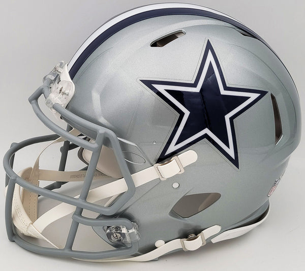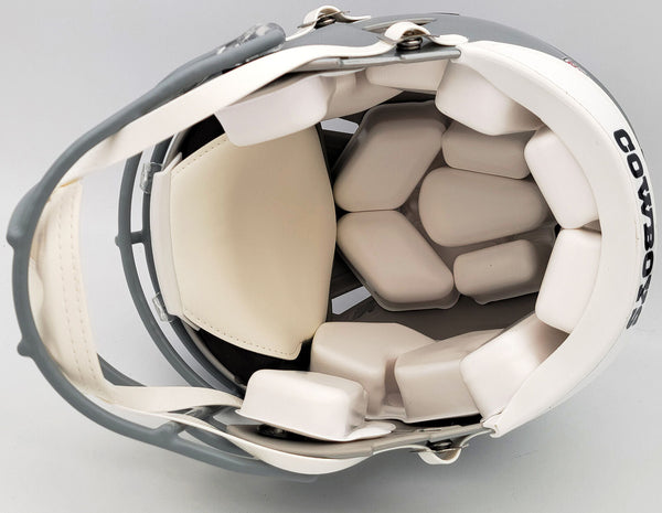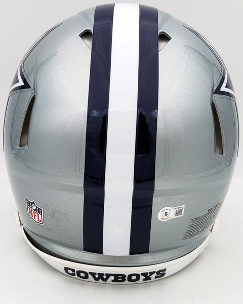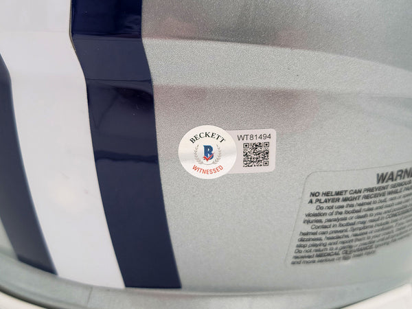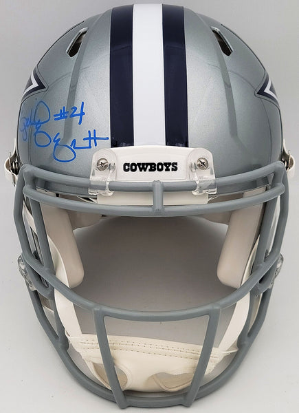 This is a Dallas Cowboys Silver Full Size Authentic Speed Helmet that has been hand signed by Ezekiel Elliott. This item has been certified authentic by Beckett Authentication (BAS) and comes with their tamper-proof QR Code sticker that can be verified on the Beckett-authentication.com.