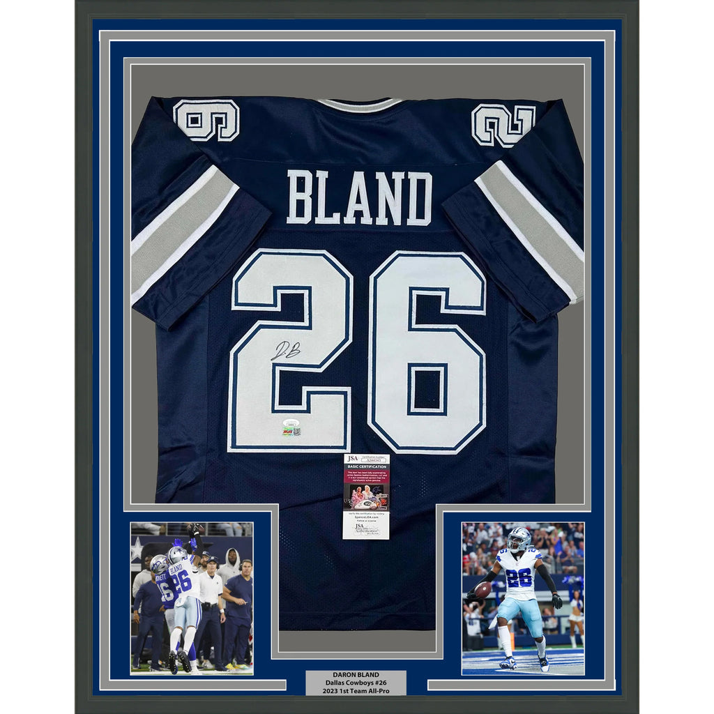 Framed Autographed/Signed Daron Bland 35x39 Dallas Blue Football Jersey JSA COA The item is professionally framed and matted with two 5x7 photos, measures 35 inches by 39 inches and is ready to be hung in your man cave! Photo and matting requests can be made.