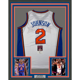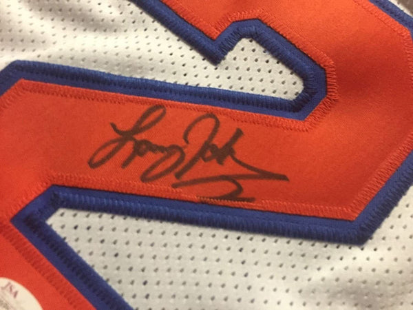 Framed Autographed/Signed Larry Johnson 33x42 New York White Jersey JSA COA The item is professionally framed & matted with two 8x10 photos, measures 33"x42" and is ready to be hung in your man cave! NOTE: COA card will be mounted on the back of the frame, not inside it on top of the jersey as seen in the picture. Photo and matting requests can be made.