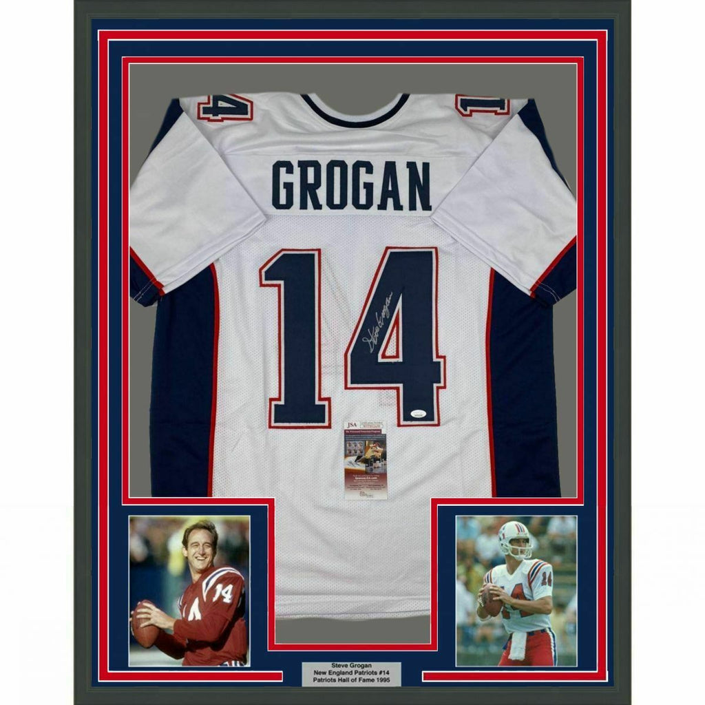 FRAMED Autographed/Signed STEVE GROGAN 33x42 New England White Jersey JSA COA The item is professionally framed & matted with two 8x10 photos, measures 33"x42" and is ready to be hung in your man cave! NOTE: COA card will be mounted on the back of the frame, not inside it on top of the jersey as seen in the picture.