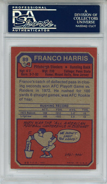 Franco Harris Autographed 1973 Topps #89 Rookie Card HOF PSA Slab 43587 The number in the listing title is just an inventory sku for our records and is not the authentication number. This is the exact item that you will receive so please see pictures for condition. This is a trading card that was personally autographed by Franco Harris with HOF inscription. This has been professionally slabbed by Professional Authentication Services (PSA) and includes a certificate of authenticity from Denver Autographs.
