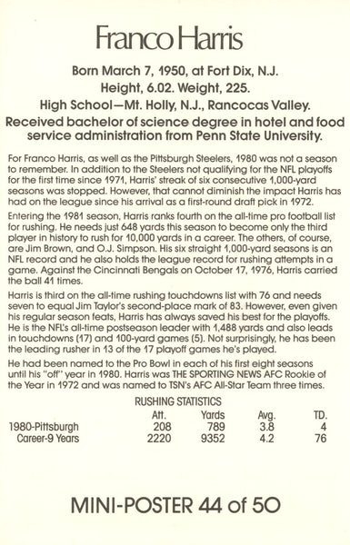 Franco Harris Signed Pittsburgh Steelers Mini Poster 44/50 HOF Beckett 46192