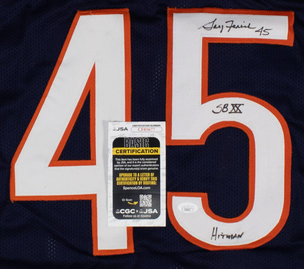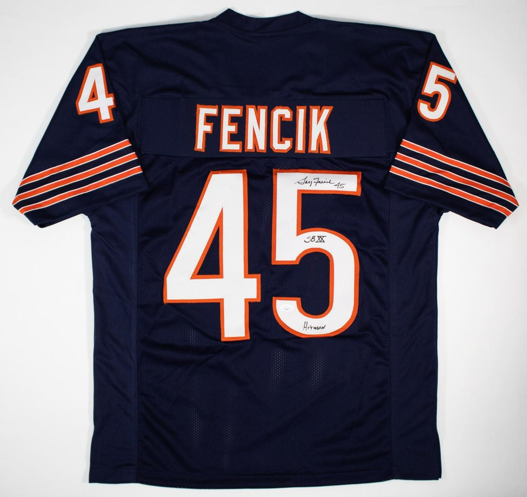 Custom on-field style jersey. Everything is sewn on, size XL. Hand-signed and inscribed in black felt-tip pen by Gary Fencik. The lot / autograph(s) includes an official James Spence Authentication (JSA) hologram and matching COA for authenticity purposes. Authentication: JSA COA