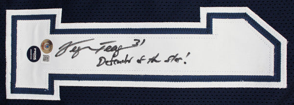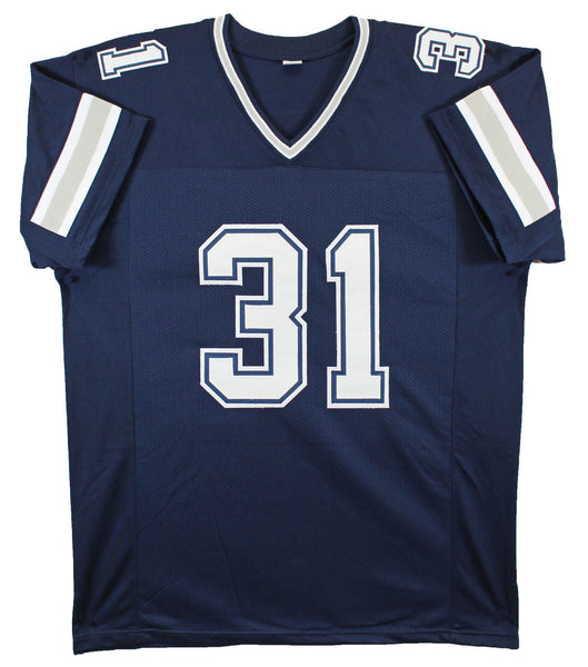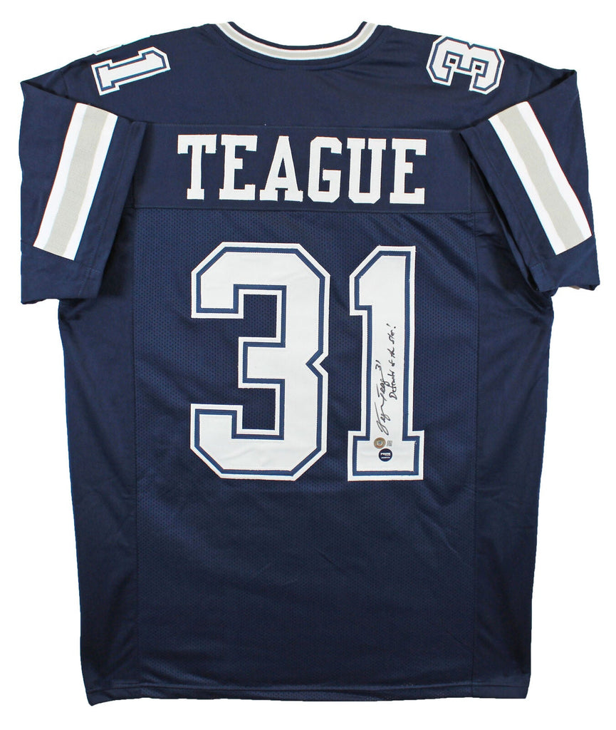 This Autographed Navy Blue Pro Style Jersey with the inscription of "Defend The Star" has been Personally Signed by George Teague of the Dallas Cowboys. This item is 100% Authentic to include a hologram by Beckett Authentication Services. This item will come with an affixed Beckett Authentication Services (BAS) authentication sticker, which includes a scannable QR code to verify authenticity. Please note that Beckett no longer provides serial-numbered COA cards, and the attached BAS sticker will serve as the complete authentication for this item. This is a BAS Witnessed Protection Program item which means a Beckett Authentication Service representative was present when this item was being signed. We conducted an autograph signing with George Teague where multiples of the same item were signed. While the photographs are representative of this item, the size, placement and strength of the signature may vary. Each item is hand signed, therefore, each autograph is unique. This item can be verified through BAS Witnessed. This is a X-Large sized, non-branded, custom-stitched Jersey.