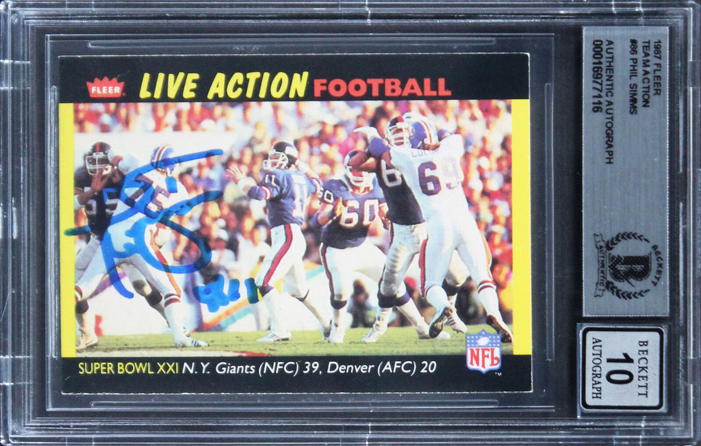 This Autographed Auto Graded Gem Mint 10! 1987 Fleer Team Action #86 Card has been Personally Signed by Phil Simms of the New York Giants. This item is 100% Authentic, it comes slabbed and authenticated by Beckett Authentication Services. The authenticity can be verified on Beckett Authentication Services website.