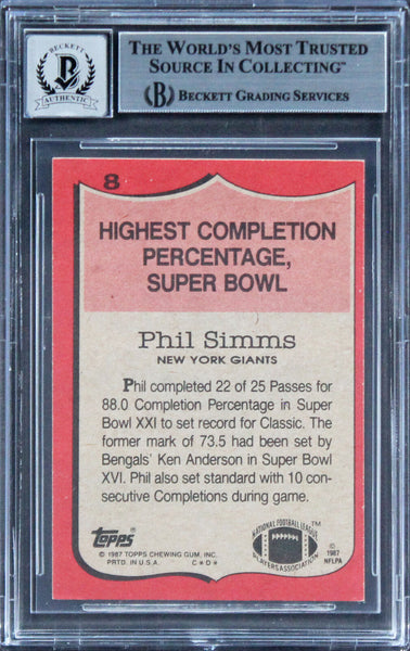 This Autographed Auto Graded Gem Mint 10! 1987 Topps #8 RB Card has been Personally Signed by Phil Simms of the New York Giants. This item is 100% Authentic, it comes slabbed and authenticated by Beckett Authentication Services. The authenticity can be verified on Beckett Authentication Services website.
