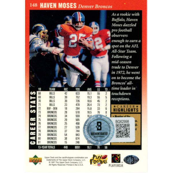 The number in the listing title is just an inventory sku for our records and is not the authentication number. The item pictured is the exact item you will receive, please see photos for condition. This is a Denver Broncos 1997 Upper Deck #148 Trading Card that was personally autographed by Haven Moses. Includes a certificate of authenticity from Beckett Authentication Services (BAS) and Denver Autographs. FREE SHIPPING within the USA on orders over $99!