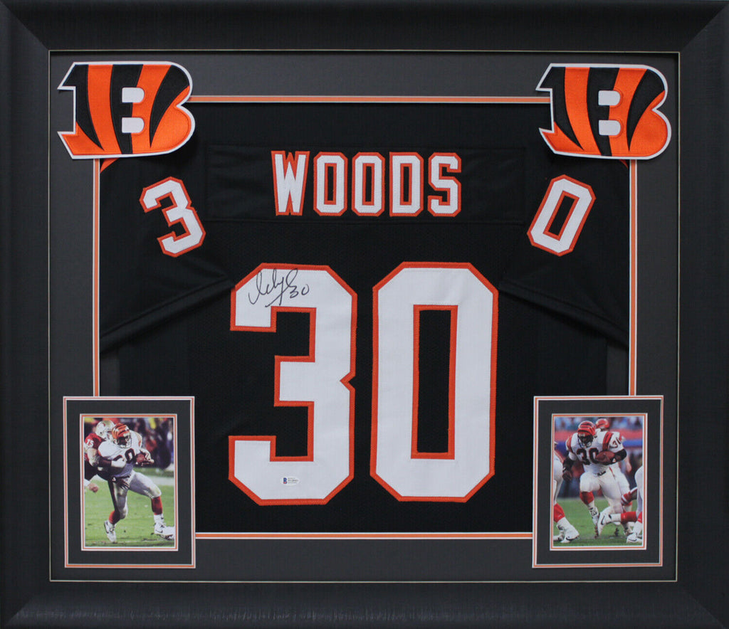 This Autographed Black Pro Style Framed Jersey has been Personally Signed by Ickey Woods of the Cincinnati Bengals. This item is 100% Authentic to include a Certificate of Authenticity (COA) / hologram by JSA Witness. This is a JSA Witnessed Protection Program item which means a JSA representative was present when this item was being signed. We conducted an autograph signing with Ickey Woods where multiples of the same item were signed. While the photographs are representative of this item, the size, placement and strength of the signature may vary. Each item is hand signed, therefore, each autograph is unique. This item can be verified through JSA Witness. This item has been professionally framed to overall dimensions of approximately 32 x 37 inches. This is a X-Large sized, non-branded, custom-stitched Framed Jersey. This jersey will be framed to order, it will take 3-4 days from purchase date for it to ship.