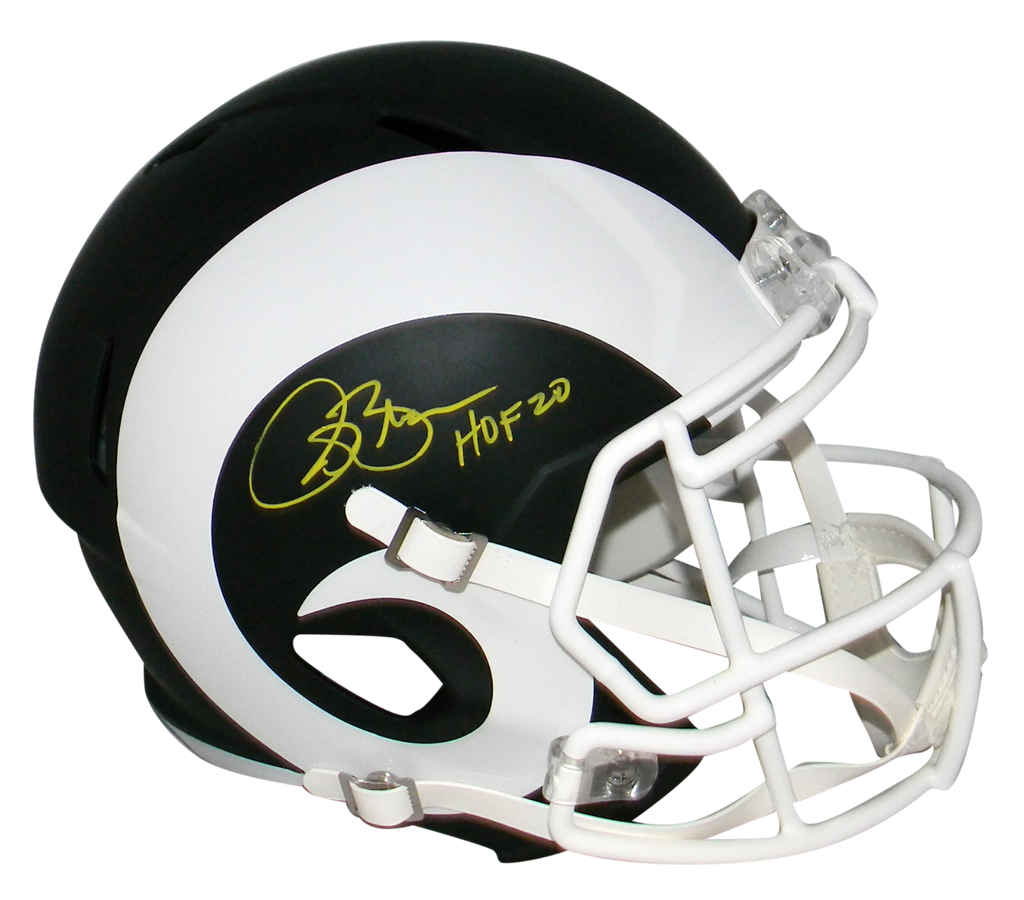 Isaac Bruce, former All-Pro wide receiver for the St. Louis Rams, has hand signed this Rams Riddell Speed Flat Black full-size replica helmet at a private signing. He included the inscription "HOF 20" with his signature. This item comes with a certificate of authenticity (COA) from Beckett Authentication Services and was signed in the presence of one of their representatives. You will receive a serial-numbered COA along with a matching serial-numbered sticker on the helmet. The authenticity can be verified online by entering the serial number.Item pictured may not be the exact item you will receive. It will be similar quality, and we guarantee your satisfaction.