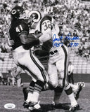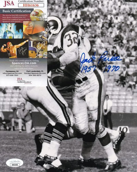 This autographed 8x10 photo has been personally hand-signed by Jack Pardee of the Los Angeles Rams. Pardee added the inscription "1957-1970" along with his signature. Note: The photo shows Jack making a tackle on Bears halfback Brian Piccolo (Brian's Song).This autograph is certified by James Spence Authentication (JSA). It comes with the numbered hologram and matching Certificate of Authenticity.