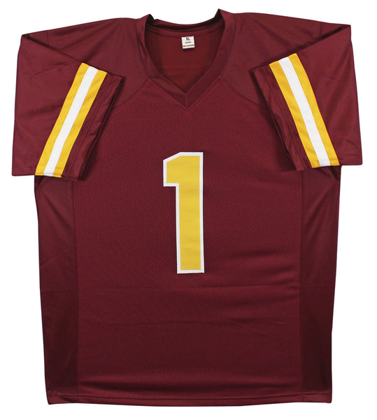 This Autographed w/ Yellow Numbers Maroon Pro Style Jersey has been Personally Signed by Jahan Dotson of the Washington Commanders. This item is 100% Authentic to include a Certificate of Authenticity (COA) / hologram by JSA. We conducted an autograph signing with Jahan Dotson where multiples of the same item were signed. While the photographs are representative of this item, the size, placement and strength of the signature may vary. Each item is hand signed, therefore, each autograph is unique. This item can be verified through JSA. This is a X-Large sized, non-branded, custom-stitched Jersey.