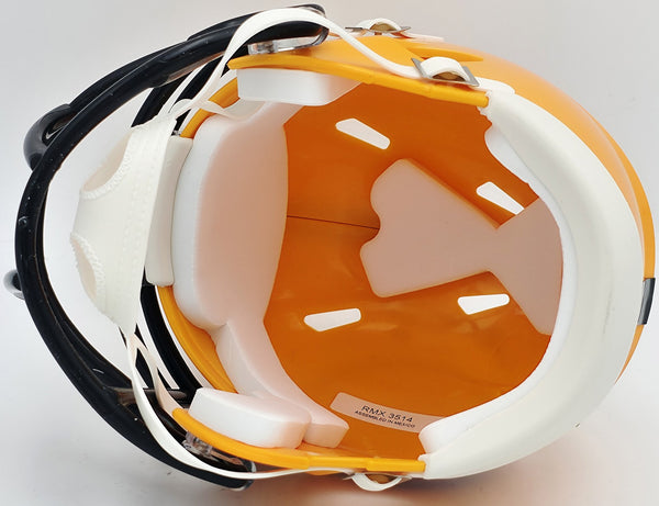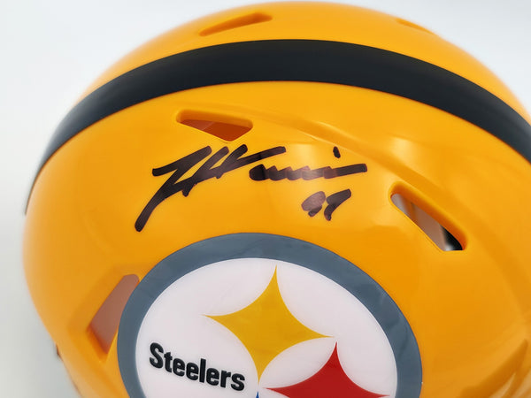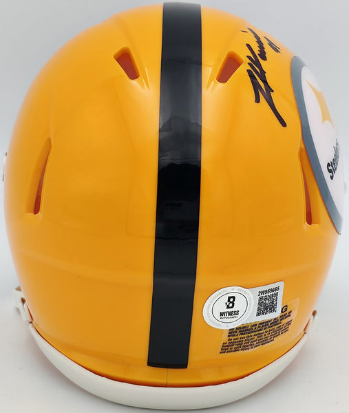 This is a Pittsburgh Steelers Throwback Gold Speed Mini Helmet that has been hand signed by James Harrison. This item has been witnessed and certified authentic by Beckett Authentication (BAS) and comes with their tamper-proof witness hologram.