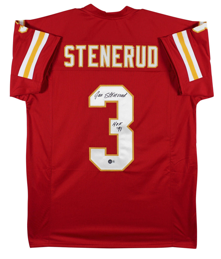 This Autographed Red Pro Style Jersey with the inscription of "HOF 91" has been Personally Signed by Jan Stenerud of the Kansas City Chiefs. This item is 100% Authentic to include a hologram by Beckett Authentication Services. This item will come with the new Beckett Authentication hologram that has a scannable QR code rather than the traditional COA. If you would like to have a COA, you are welcome to reach out to Beckett for a printed certification once you receive your item. This is a BAS Witnessed Protection Program item which means a Beckett Authentication Service representative was present when this item was being signed. This is a stock item. We conducted an autograph signing with Jan Stenerud and we have several of these available. The one you will receive will be of equal quality to the one pictured. This item can be verified through BAS Witnessed. This is a X-Large sized, non-branded, custom-stitched Jersey.