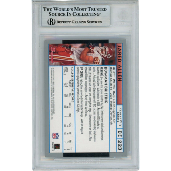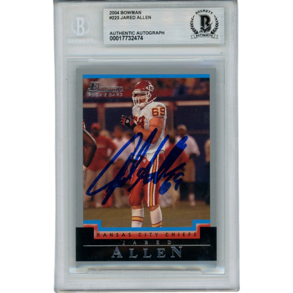 The number in the listing title is just an inventory sku for our records and is not the authentication number. This is a Kansas City Chiefs 2004 Bowman #223 trading card that was personally autographed by Jared Allen. This was slabbed by Beckett Authentication Services (BAS) includes a certificate of authenticity from Denver Autographs.FREE SHIPPING within the USA on orders over $10!