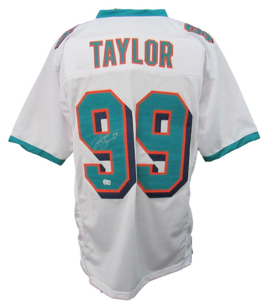 Jason Taylor Signed/Autographed Dolphins White Custom Football Jersey. This jersey is authenticated by BAS/Beckett and includes their Tamper-proof Hologram Sticker.