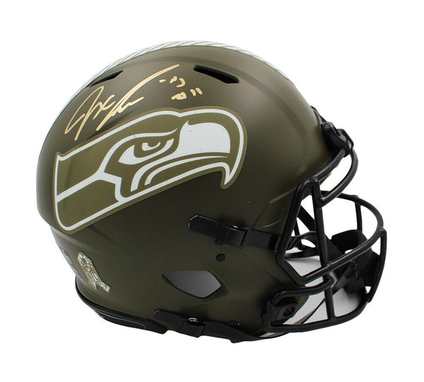 A Seattle Seahawks Speed Authentic Salute to Service NFL Helmet hand signed by Jaxon Smith-Njigba. The item and signature are in excellent condition. Jaxon was drafted in the 2023 NFL draft by the Seattle Seahawks. He played for the Ohio State Buckeyes in college. AUTHENTICATION: The item is accompanied by a Fanatics Authentic Serial Numbered and Databased Hologram