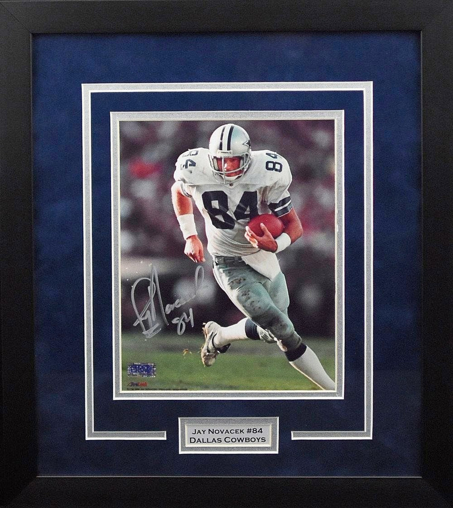 Jay Novacek, former star tight end for the Dallas Cowboys, has hand signed this 8x10 photo at a private signing. It comes professionally framed in a black wood frame and double matted in Cowboys colors. This item comes with a certificate of authenticity (COA) from Signature Sports Marketing, one of the leaders in the industry. You will receive a paper COA along with matching serial-numbered holograms.Item pictured may not be the exact item you will receive. It will be similar quality, and we guarantee your satisfaction.