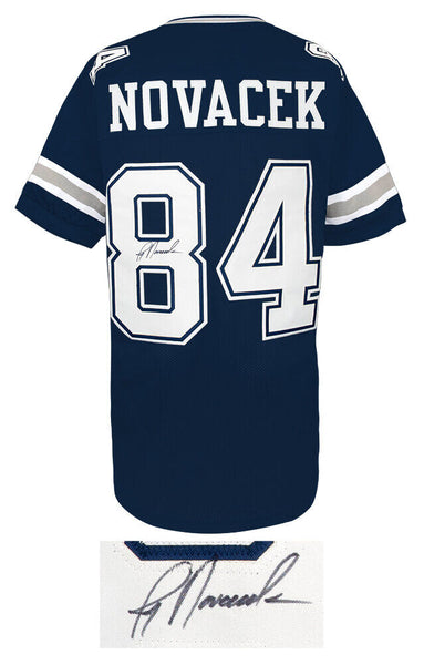 Jay Novacek signed navy custom football jersey. Item comes with a Schwartz Sports Memorabilia tamper-proof numbered hologram and Certificate of Authenticity which can be verified online.