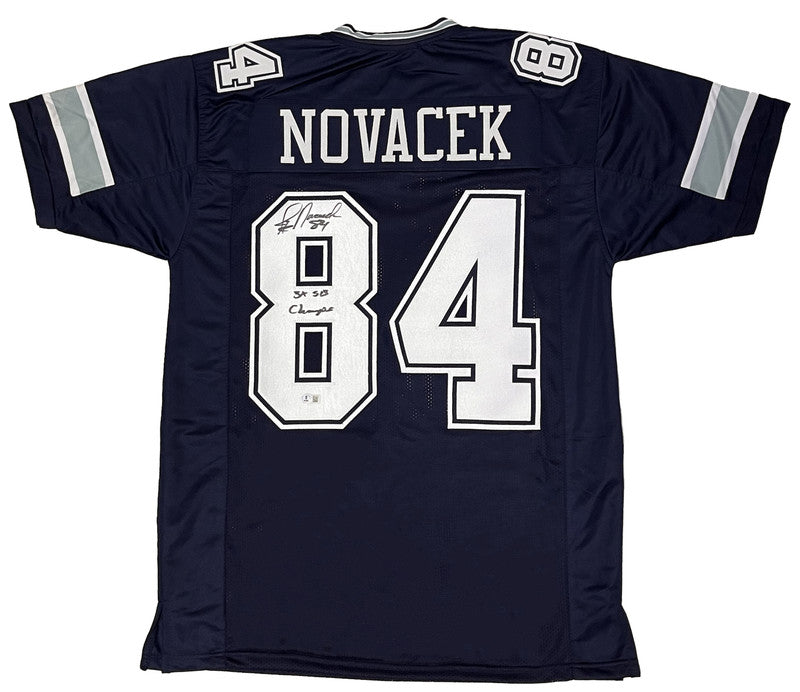 This custom blue jersey has been personally hand-signed by Jay Novacek of the Dallas Cowboys. It comes with an individually numbered, tamper-evident hologram from Beckett Authentic. To ensure authenticity, the hologram can be reviewed online. This process helps to ensure that the product purchased is authentic and eliminates any possibility of duplication or fraud.