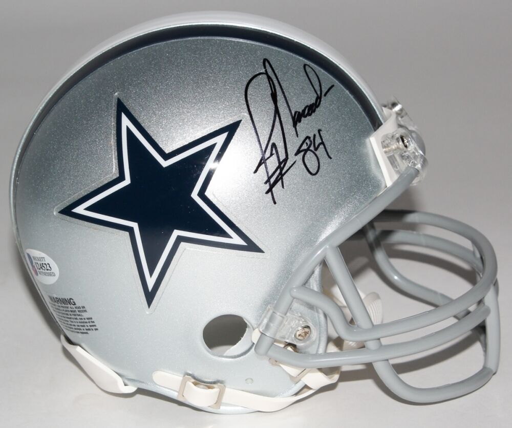 Riddell mini helmet. Hand-signed in black felt tip pen by Jay Novacek (Dallas Cowboys, Arizona Cardinals). The autograph includes an official Beckett Authentication Services serially numbered hologram and matching COA for authenticity purposes.Authentication: Beckett COA