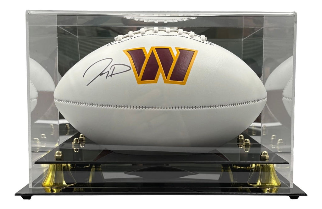 Featured is a Jayden Daniels signed Washington Commanders logo football. This ball has been hand signed by Daniels and comes with Fanatics authentication. Included with this ball is a deluxe acrylic display case. This ball would make a great addition to any sports memorabilia collection. SPECIFICATIONS Autographed By: Jayden Daniels Team: Washington Commanders Sport: Football Authentication: Fanatics Authentic