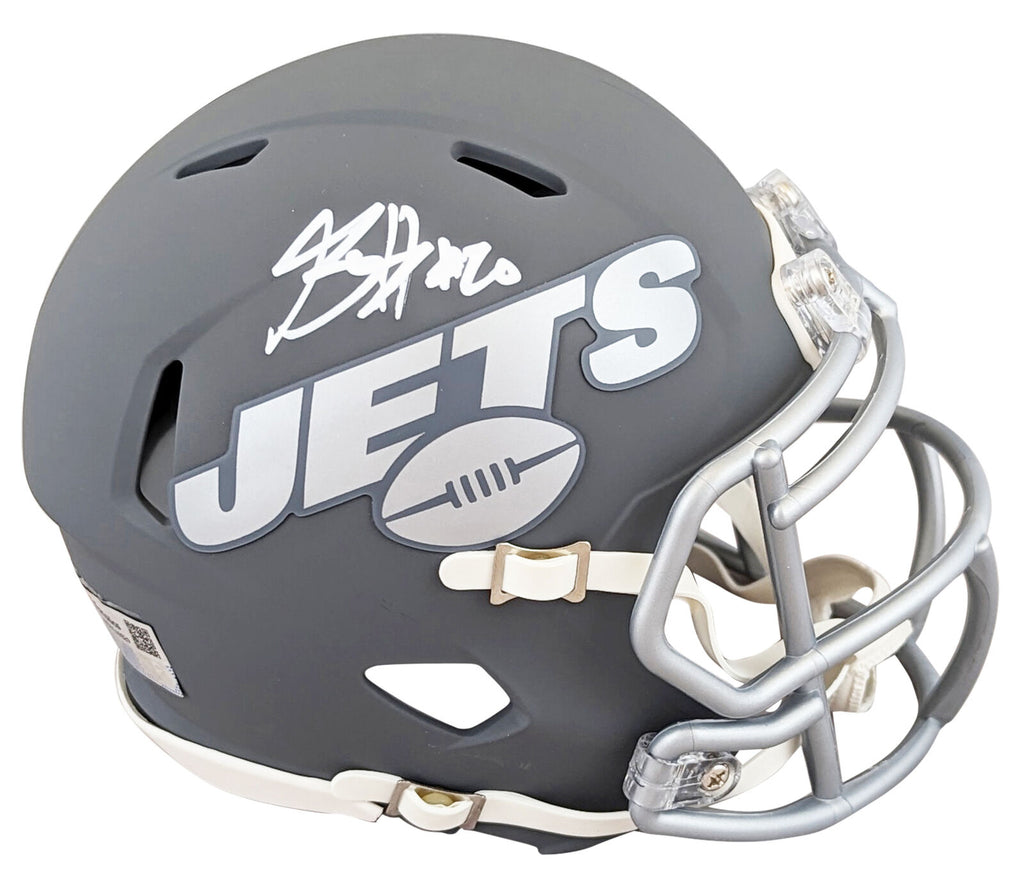 This Autographed Alternate Slate Speed Mini Helmet has been Personally Signed by Breece Hall of the New York Jets. This item is 100% Authentic to includes a numbered hologram by Fanatics. We conducted an autograph signing with Breece Hall where multiples of the same item were signed. While the photographs are representative of this item, the size, placement and strength of the signature may vary. Each item is hand signed, therefore, each autograph is unique. This item can be verified through Fanatics.