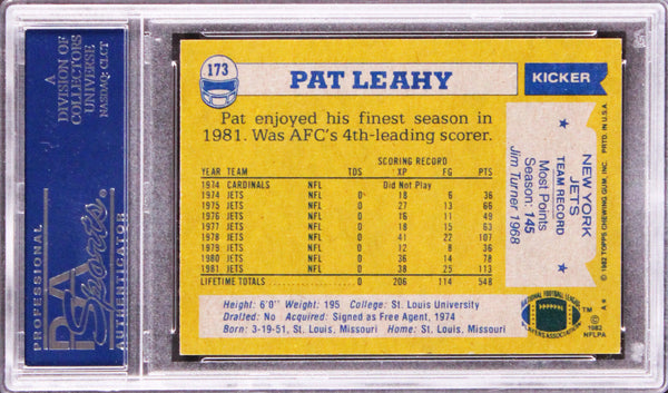 This Autographed 1982 Topps #173 Card has been Personally Signed by Pat Leahy of the New York Jets. This item is 100% Authentic, it comes slabbed and authenticated by PSA/DNA. The authenticity can be verified on Professional Sports Authenticator website.