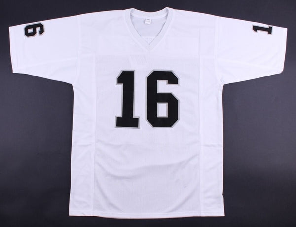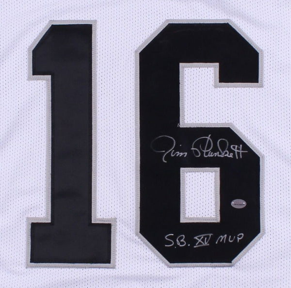Custom on-field style jersey. Everything sewn on, size XL. Hand-signed and inscribed in silver felt tip pen by Jim Plunkett. The autograph includes an official Jim Plunkett hologram from GT Sports Marketing (GTSM) for authenticity purposes.Authentication: Jim Plunkett GTSM Hologram