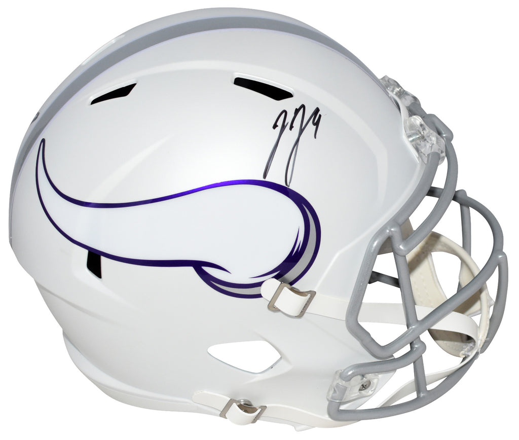 JJ McCarthy, star quarterback for the Minnesota Vikings, has hand signed this Vikings Riddell Speed full-size replica helmet at a private signing. This item is authenticated by Beckett Authentication Services and was signed in the presence of one of their representatives. Their tamper-evident hologram featuring a QR code and serial number is on the item. The authenticity can be verified online by entering the serial number or scanning the QR code.Item pictured may not be the exact item you will receive. It will be similar quality, and we guarantee your satisfaction.