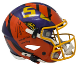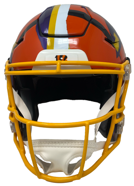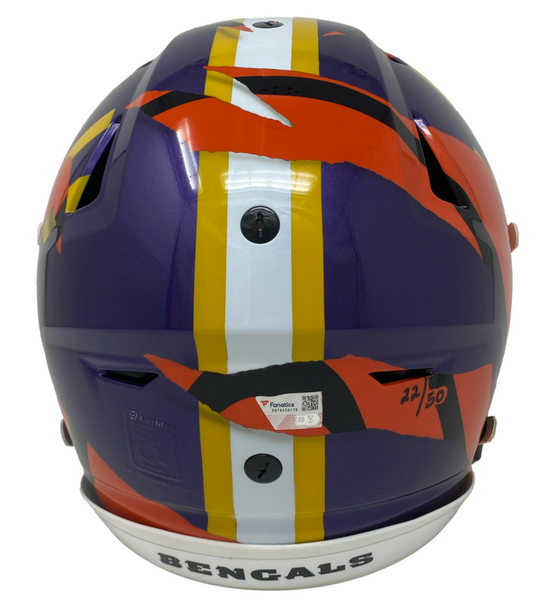 This ECC Custom hand painted LSU / Bengals Ripped SpeedFlex authentic helmet has been personally hand-signed by Joe Burrow with the added inscription "2020 #1 Pick." It comes with an individually numbered, tamper-evident hologram from Fanatics Authentic. To ensure authenticity, the hologram can be reviewed online. This process helps to ensure that the product purchased is authentic and eliminates any possibility of duplication or fraud.