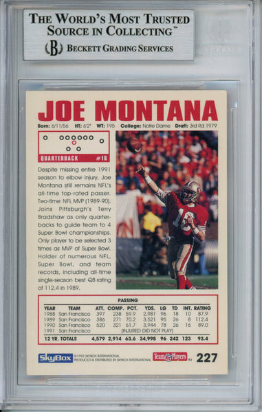 Joe Montana Autographed 1992 Skybox #227 Trading Card Beckett Slab 37552 The number in the listing title is just an inventory sku for our records and is not the authentication number. The item pictured is a stock photo unless otherwise noted. This is a trading card that was personally autographed by Joe Montana. This has been professionally slabbed by Beckett Authentication Services (BAS) and includes a certificate of authenticity from Denver Autographs.