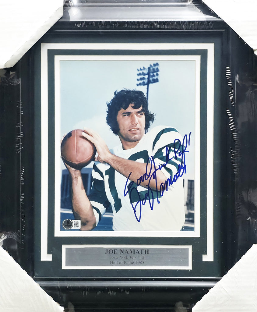 This is a Framed 8x10 Photo, approximately 15x18 with the frame, that has been hand signed by Joe Namath. This item was inscribed "Good Luck Pal!." This item has been certified authentic by Beckett Authentication (BAS) and comes with their tamper-proof QR Code hologram.