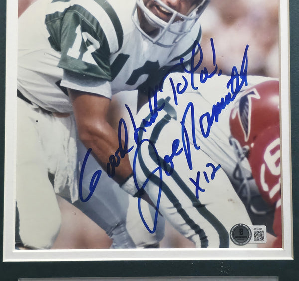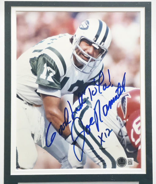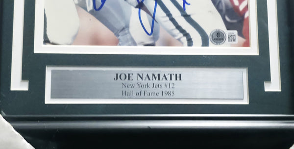This is a Framed 8x10 Photo, approximately 15x18 with the frame, that has been hand signed by Joe Namath. This item was inscribed "Good Luck To You! x12." This item has been certified authentic by Beckett Authentication (BAS) and comes with their tamper-proof QR Code hologram.