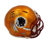 A Washington Commanders Speed Flash NFL Mini Helmet hand signed by Joe Theismann. The item and signature are in excellent condition. In addition to signing his name, Joe also inscribed "SB XVII Champs" on the item. Joe Theismann is a former NFL Quarterback. He played 12 seasons with the Washington Commanders. He is a Super Bowl XVII Champion, 1983 NFL MVP, 2x Pro Bowler, 1983 NFL Offensive Player of the Year. AUTHENTICATION: The item is accompanied by a JSA Certificate of Authenticity - JSA Serial Numbered and Databased Hologram