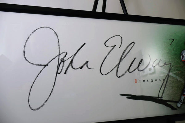 Showcase your admiration for Broncos legend John Elway with our John Elway Denver Broncos Autograph Framed piece. This collector's item features the authentic signature of the Hall of Famer and is elegantly framed for a stunning presentation. Here are the details: Key Features:- **Autographed Photo:** Personally signed by John Elway, showcasing his authentic signature on a high-quality photo capturing iconic moments from his Broncos career.- **Premium Framing:** The autographed photo is expertly framed, adding sophistication to the overall presentation and making it ready for display.- **Hall of Fame Tribute:** Commemorates John Elway's illustrious career, celebrating his achievements as a Broncos legend and Hall of Famer.- **Ready to Display:** The framed piece is ready to be showcased in your home, office, or sports memorabilia collection.Upper Deck COA