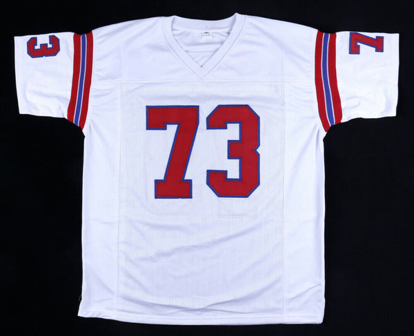 This autographed jersey has been personally hand-signed by John Hannah of the New England Patriots. Hannah added the inscription "HOF 91" along with his signature. This autograph is certified by PSA/DNA's (Professional Sports Authenticators) In The Presence authentication. That means that a PSA representative was present when this item was signed. It comes with the PSA numbered hologram and matching Certificate of Authenticity.Custom on-field style jerseys are a more affordable option for autograph seekers. These jerseys do not have any brand name or tags and are made in the Philippines. They feature stitched on names and numbers and are made to look very similar to the on-field jerseys that the players wear. These custom jerseys are very commonly used in the memorabilia industry.