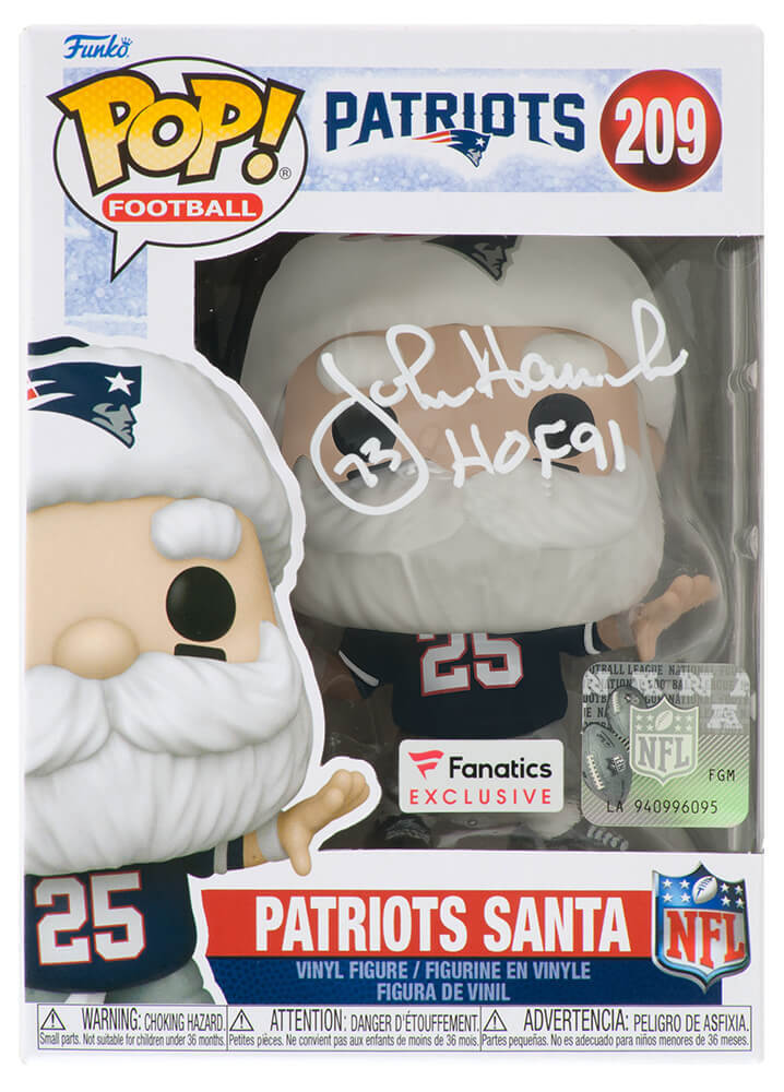 John Hannah signed New England Patriots 'SANTA' Funko Pop doll #209 with 'HOF 91' inscription. Item comes with a Schwartz Sports Memorabilia tamper-proof numbered hologram and Certificate of Authenticity which can be verified online.