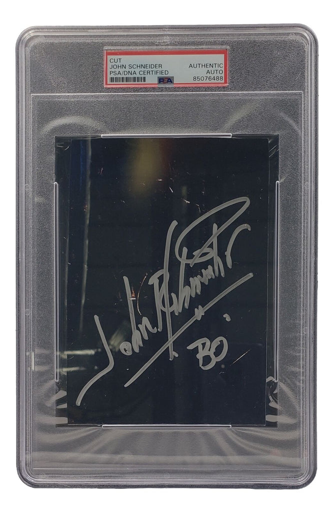 Featured is a John Schneider signed Dukes of Hazard cut signature. This cut has been hand signed by Schneider and has been authenticated and encapsulated by PSA/DNA. This cut would make a great addition to any sports memorabilia collection!. SPECIFICATIONS Autographed By: John Schneider Team: Sport: Authentication: Professional Sports Authenticator (PSA)
