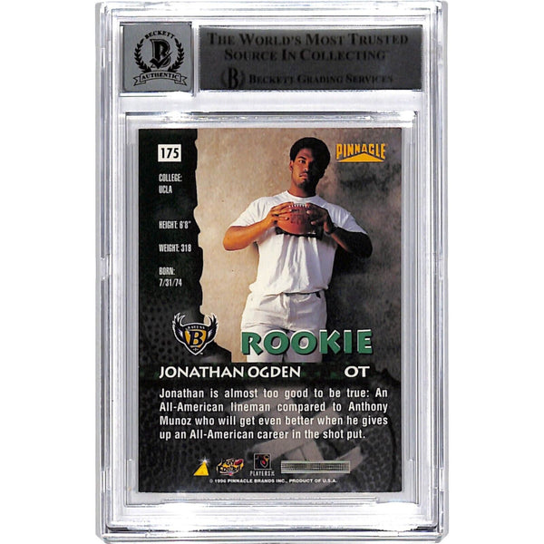 The number in the listing title is just an inventory sku for our records and is not the authentication number. The item pictured is a stock photo unless otherwise noted. This is a 1996 Pinnacle #175 slabbed trading card that was personally autographed by Jonathan Ogden with "HOF 12" inscription. Includes a certificate of authenticity from Beckett Authentication Services (BAS) and Denver Autographs.FREE SHIPPING within the USA on orders over $10!