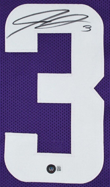 Custom on-field style jersey. Everything is sewn on, size Adult XL. Hand-signed in silver paint pen by Jordan Addison.The autograph includes an official Beckett Authentication Services serially numbered hologram and QR Code Card for authenticity purposes. The signing of this item was witnessed by Beckett.Authentication: Beckett Hologram with QR Code Card