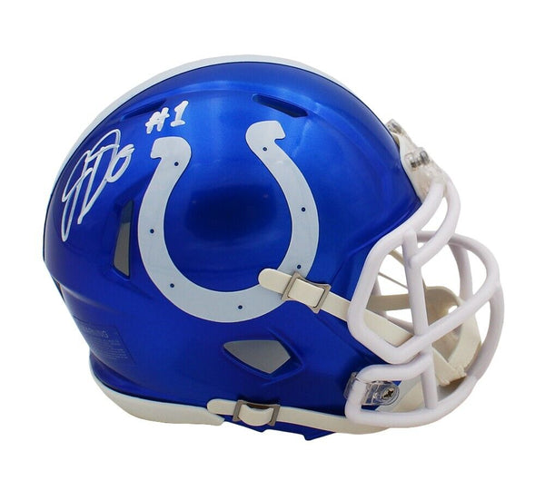 An Indianapolis Speed Flash Mini Helmet hand signed by Josh Downs. The item and signature are in excellent condition. Josh was drafted into the NFL in 2023 round: 3 pick 79. Josh is a wide receiver for the Indianapolis Colts. AUTHENTICATION: Your item has been tagged with a SmarTag powered by Prova Technology, which gives you digital access to your items authentication records, including a proof picture from the signing.