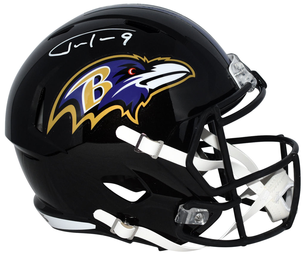 Justin Tucker, star kicker for the Baltimore Ravens, has hand signed this Ravens Riddell Speed full-size replica helmet at a private signing. This item is authenticated by Beckett Authentication Services and was signed in the presence of one of their representatives. Their tamper-evident hologram featuring a QR code and serial number is on the item. The authenticity can be verified online by entering the serial number or scanning the QR code.Item pictured may not be the exact item you will receive. It will be similar quality, and we guarantee your satisfaction.